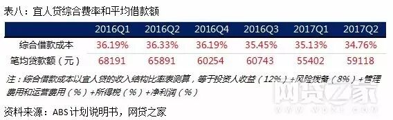 我们试图在网贷行业中验证这种规律,但由于投资者的“出借利率”不包括平台向贷款人收取的服务费,所以其综合费率被严重低估所以意义不大。为此,我们仅能使用上市公司宜人贷的业务数据进行分析。由于宜人贷提供以信用卡为进件条件的信贷产品件且客户群体的信贷行为与信用卡人群类似,我们认为其贷款综合费率与平均贷款额之间的关系有一定的参考价值。