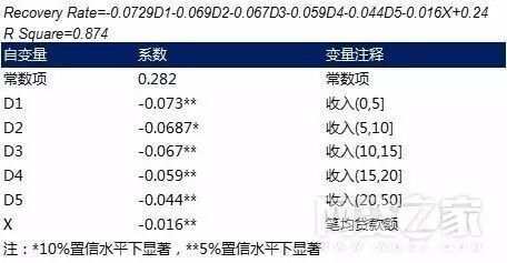 当方程中D1至D5的取值都为0时,对于收入50万以上的贷款人他们的贷款回收率函数为Recovery Rate=-0.156X+0.24,这种情况我们称其为基准类。而变量D1至D5的系数表明变量取值为1时与基准类的差距,即各个收入区间与收入50万以上的贷款回收率的差距,系数越小意味着回收率越低。回归方程中的笔均贷款系数为-0.0161,意味着笔均余额每增加1万元,回收率将降低1.61%。