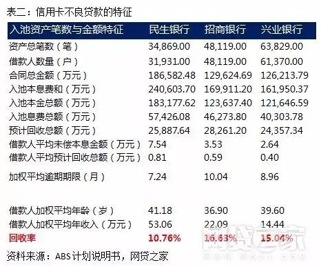 我们认为,银行信用卡人群在信用行为以及消费需求方面与互联网个人贷款有一定的共性,对于线上放款机构有一定的参考价值。目前已经有民生银行、招商银行以及兴业银行发行过以信用卡不良贷款为基础资产的资产支持证券,我们以其中的数据为基础总结了信用卡不良贷款的一些特点,并借此讨论一下目前平台风险定价中存在的问题。
